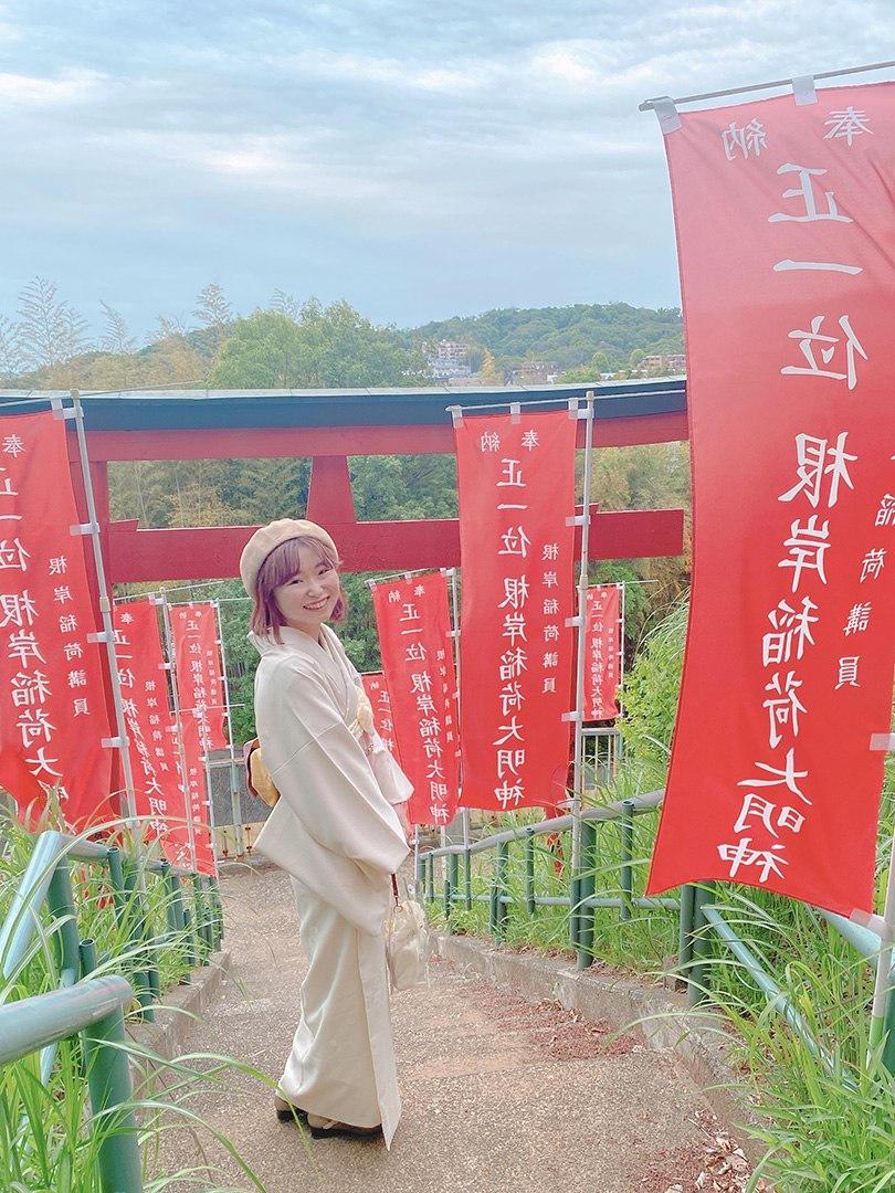 行方 桃子さん友人と旅行に行った際に撮った写真です。背景と着物がよく合っていて、お気に入りの一枚です。