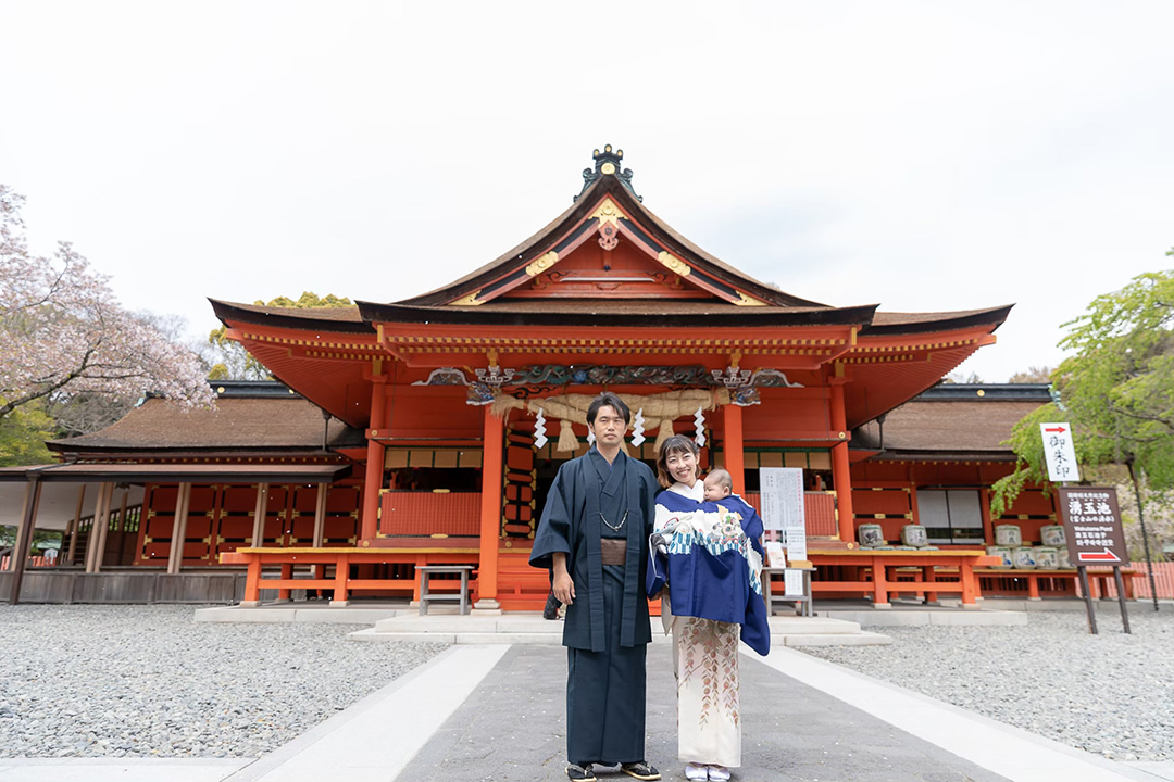 田中 由紀子さん初孫のお宮参りに来ました。天気予報は雨だったのですが祈祷して終わるまでなんとか持って良いお宮参りが出来ました。みんなで写メを撮ってる所を遠くから主人が撮ってくれました。