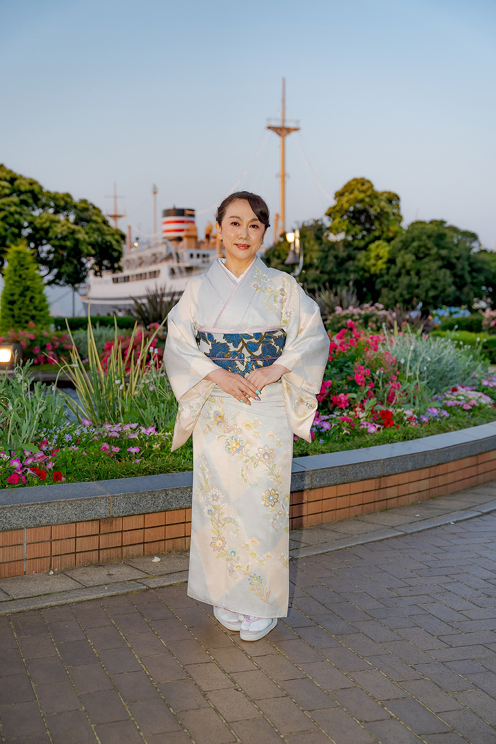 藤原 深雪さんお気に入りのお着物で横浜山下公園でロケ撮影して戴いた時のショ …